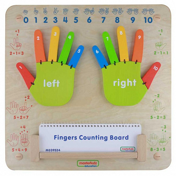 На лицевой части панели закреплены кисти рук в разных цветах, у каждого пальца есть шарнир, поэтому его можно "загнуть" во время подсчёта. На концах пальцев нанесены цифры от 1 до 10. В верхней части панели изображены цифры от 0 до 10. В нижней части панели находится подставка для хранения карточек с заданиями. По углам панели размещены отверстия для крепления панели к стене.