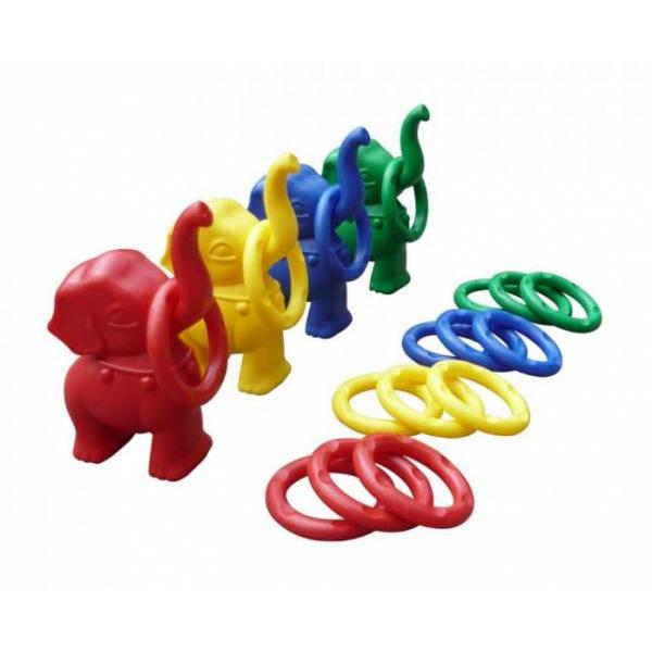 В наборе - 4 разноцветные фигурки-слоника (красная, жёлтая, зелёная, синяя) и шестнадцать колечек.